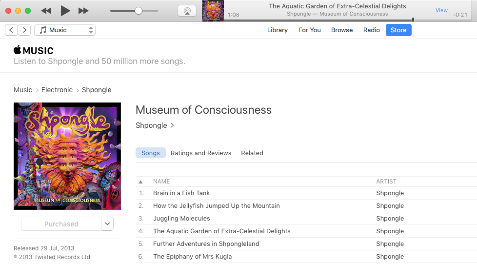 Hi, I bought a shpongle album which is showing in the store as 'purchased' but not in my Purchased list of albums. When I try to play the album, i only can listen to a short piece of each track. And I cannot download any.