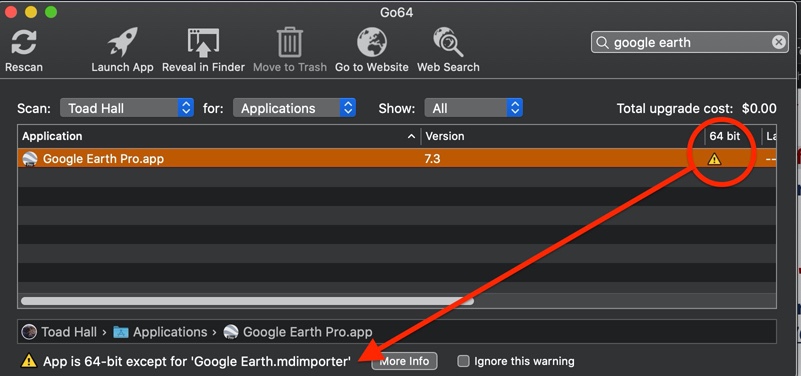 However, according to my iMac/About This Mac/System Report/Legacy Software, I have Google Earth/GoogleEarthPro/32-bit