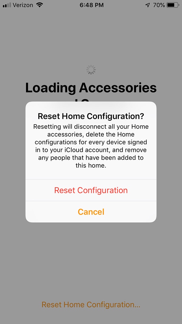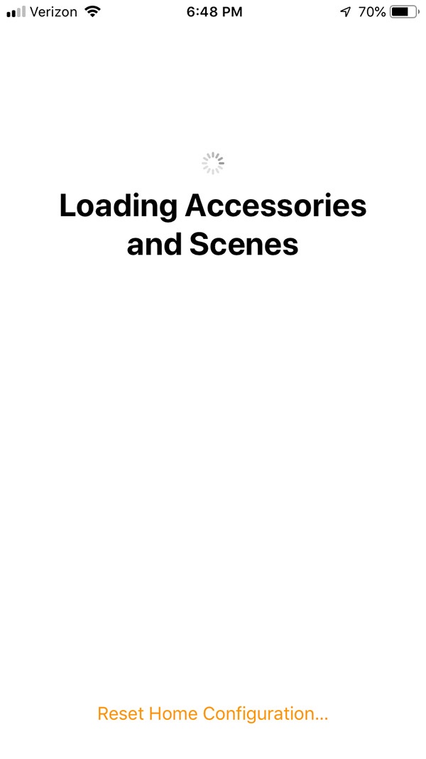 After that dead end on the Apple TV, when "Home" is opened on iphone, I now see the spinning wheel of death with "Loading Accessories and Scenes" beneath. I've been here before, it means a COMPLETE RESET of HomeKit. That is if the reset option ever shows up – it can take an hour or more. Why? I waited, the "Reset Home Configuration..." finally showed, but when "Reset Configuration" was selected, NOTHING HAPPENS! Another dead end. For now, my HomeKit has been bricked.