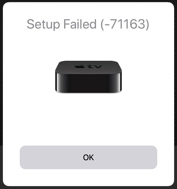 Updated 4th Gen Apple TV to latest TVOS but then noticed the lights didn't go on as usual in the evening via HomeKit. Looked in the settings of Apple TV and there was a red "1" asking to "Finish setting up Airplay2 and HomeKit". I proceeded as instructed, held phone close to the Apple TV, it attempted it's "setting up" process, but then gave a "Setup Failed (-71163) error. Tried a couple times, restarting both devices, with same result.