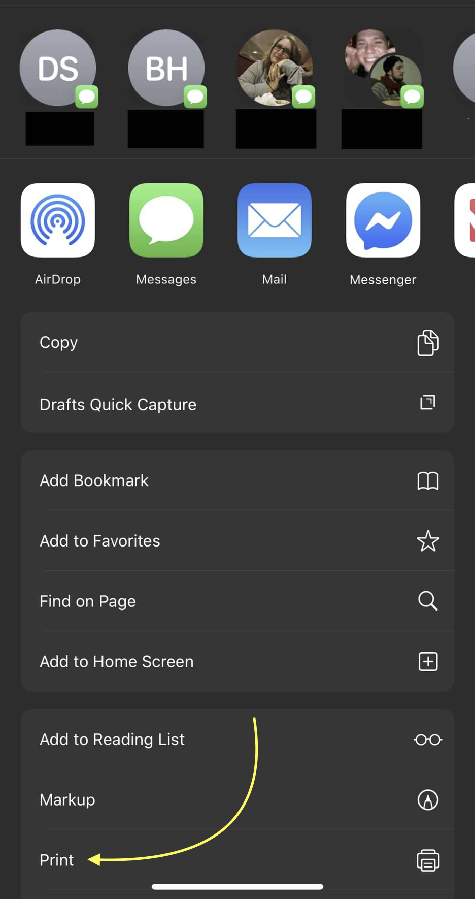 3. Scroll down and tap  or Print. If you can’t find the print option, check the app’s User Guide or Help section. Not all apps support AirPrint.