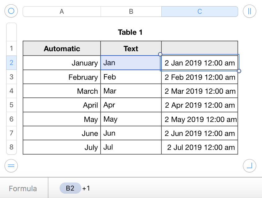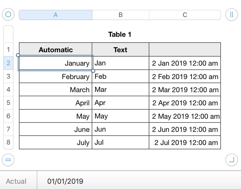 A brand new (blank) Numbers document most likely contains a table where the cells are formatted as Automatic. Numbers is very good at detecting anything that looks like a Date & Time format and will convert the cell format. Typing the first three characters of a month name (jan, feb etc.) [Column A in my example] will result in the full month name, together with the first day of that month and a time of 12:00 (midnight at the start of that day). The cell display will not automatically show the full Date & Time, but the full Date & Time is there, "hidden behind the curtain".