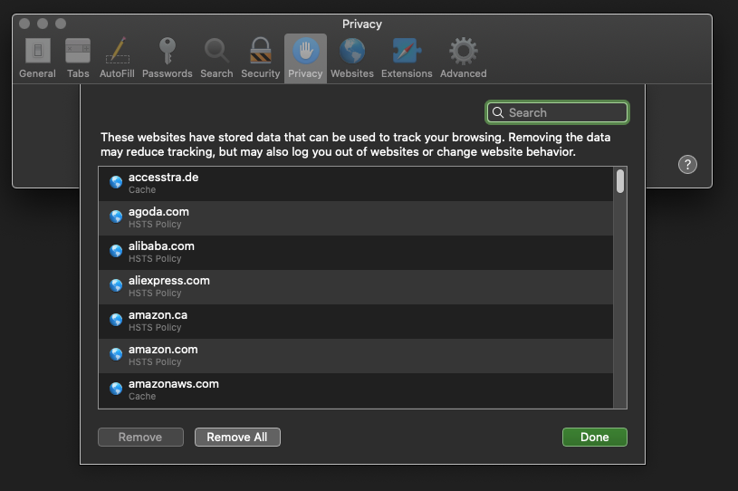 If I open "Safari Preferences"and click on "Privacy" and then down in "Manage Website Data" I got a long list that I can not delete with "REMOVE" not wirh "REMOVE ALL" even if I select some or all of them.