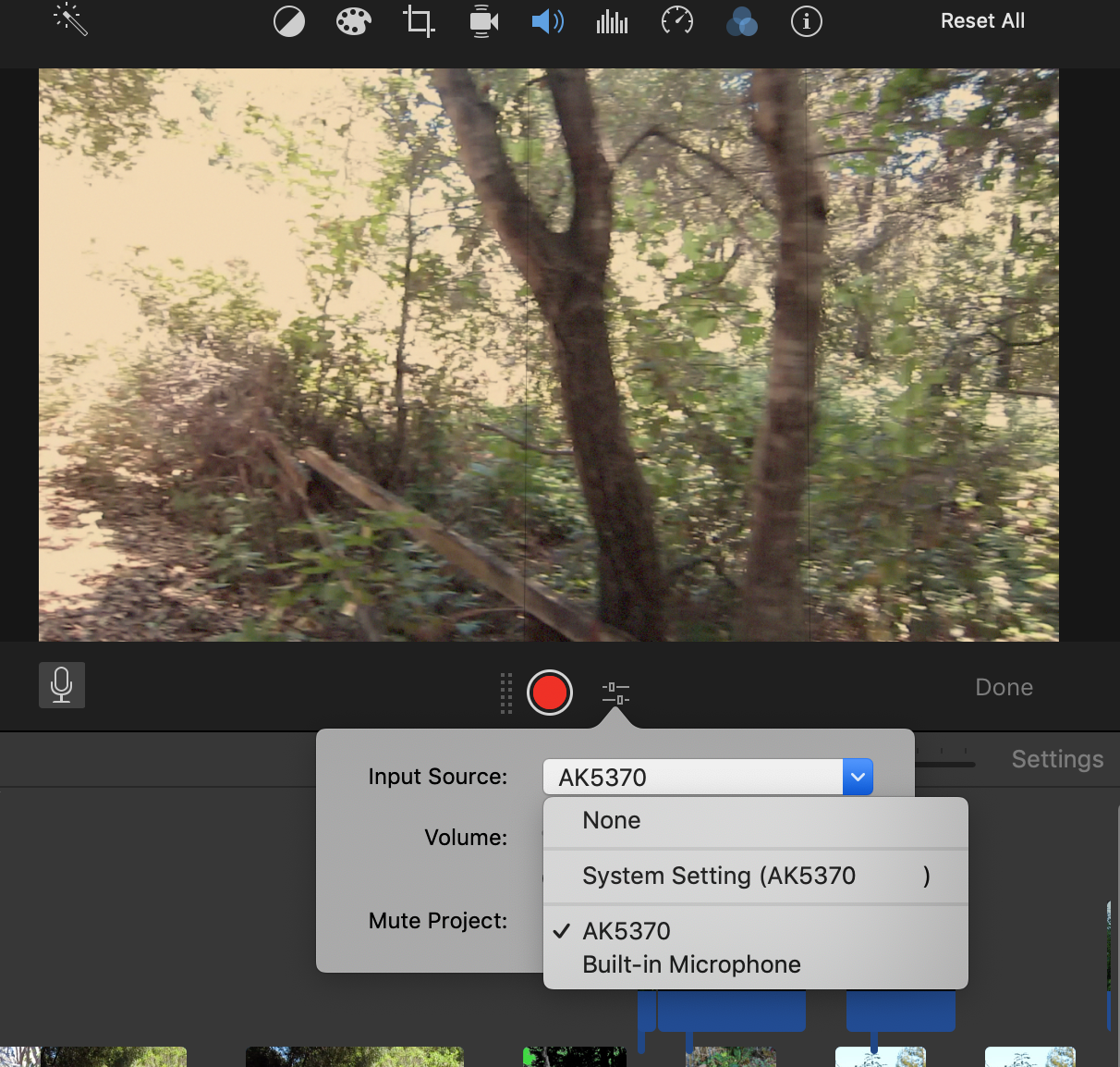 Then go to iMovie and click on the microphone emblem to the left of the preview screen. Click on the settings emblem to the right of the red button. Click on Input Source in the drop down. You should see your external mic listed. In the screen shot it is AK5370. Click on it to select it. The name of the external mic will now appear in the input box. Then start your recording.