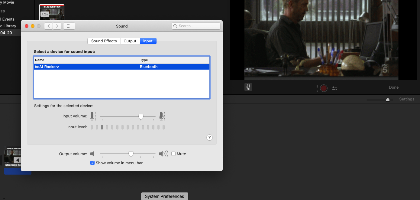 Inbuilt speaker is not working so I try to use my bluetooth as external input source to record VoiceOver. Nevertheless, it worked all perfect in Sierra but now it seems will not work .Please follow the screenshots I have tried to enable the mic select section as your screenshots and yes my bluetooth speaker work perfect with other devices and In MacBook QuickTime Playes or any other videos . The problem is faced only on iMovie