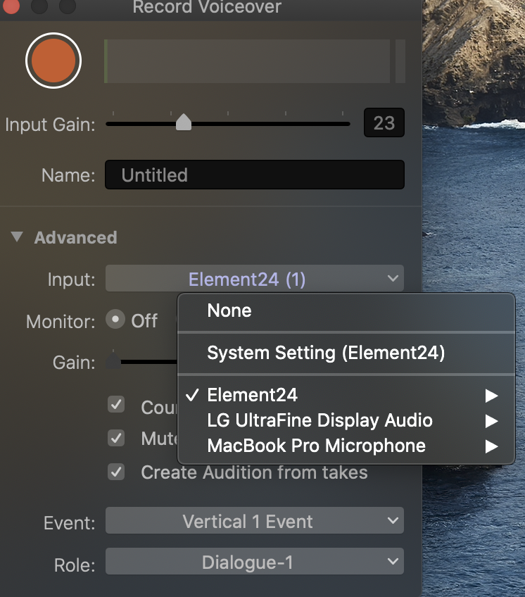 What I want to record a Voiceover in FCP using my equipment from Logic Pro X. I have the Apogee Elements 24 and a XLR microphone. So I guess this is not possible and I need a USB Microphone?