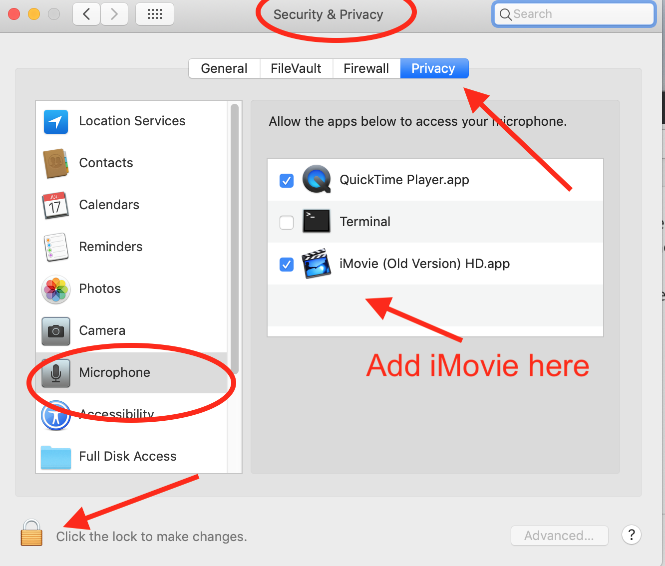Go to System Preferences>Security and Privacy>Privacy and select Microphone in the side bar. Click on the little lock at the bottom of the window and enter your administrator password to unlock the window. Then add iMovie to the box.