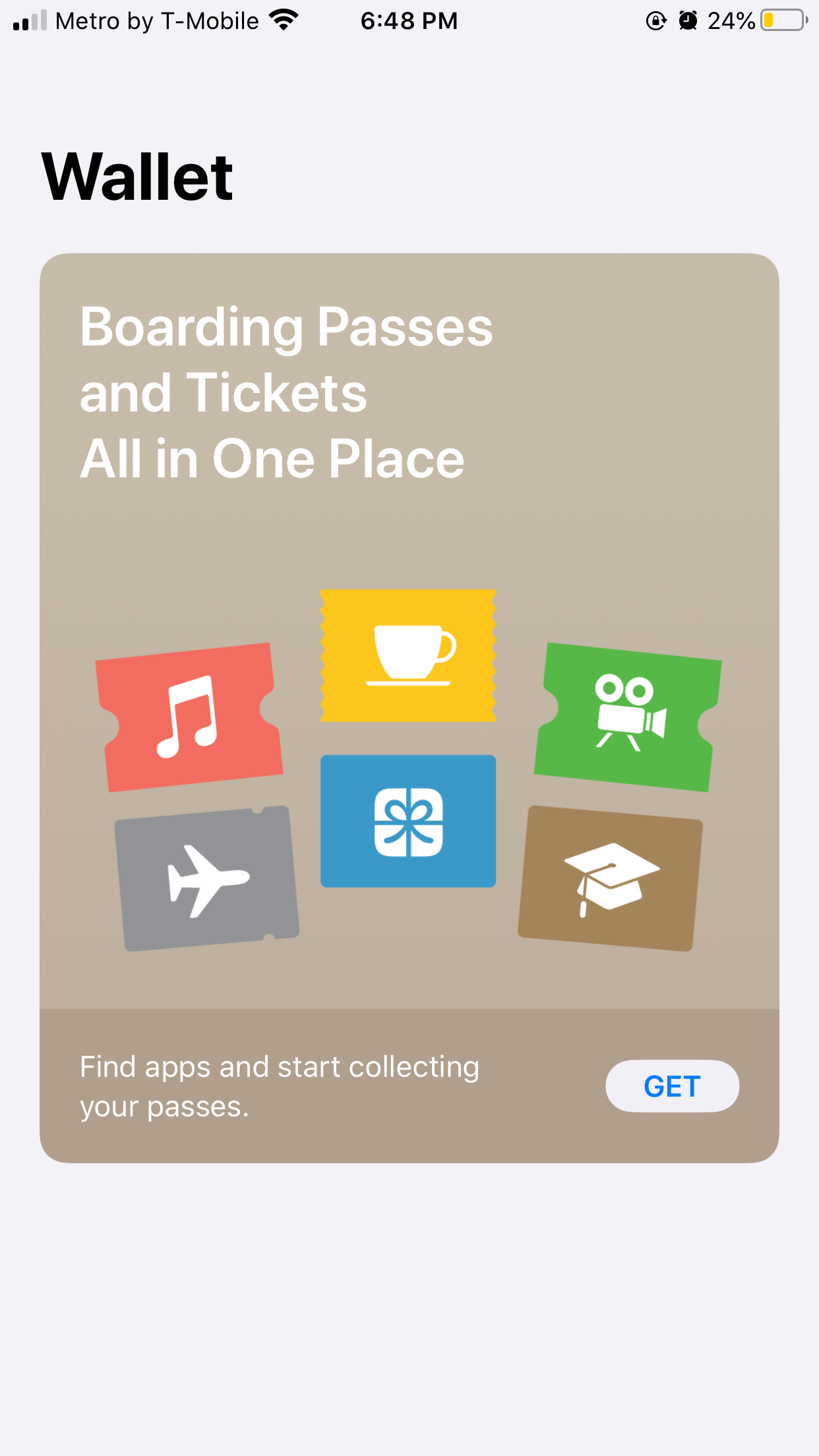 When I go to the wallet app all it shows me are boarding passes and apps to collect those passes and I want to add a card but it doesn't have that option anymore. I've reset my phone twice and I've updated my phone twice, but it's still showing boarding passes.