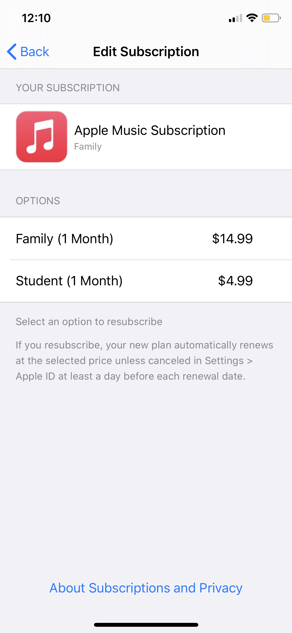 I subscribe to Apple Music. I would like to have an individual plan; however, I am not given this option. I have searched absolutely everywhere to solve this and have had no luck. On my iPhone, under subscriptions, I am given the option for Family or Student. Please advise me on how to get the individual membership plan.
