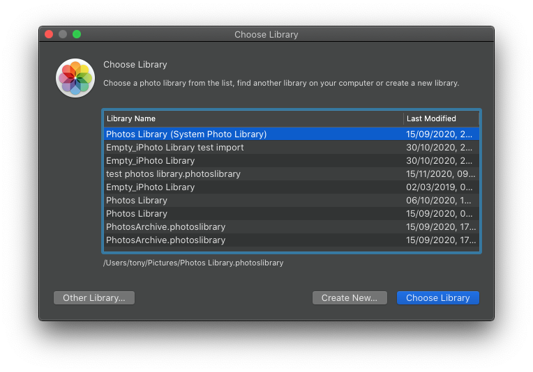 Click "create new" (this will create a new library). Put it in the pictures folder, and call it Photos Library.
