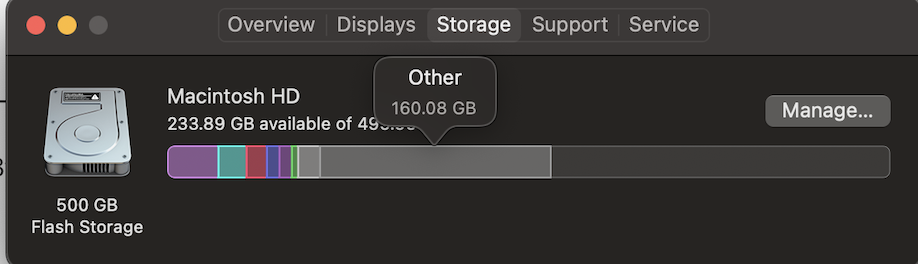 • Other: Contains files that don’t fall into the categories listed here. This category primarily includes files and data used by the system, such as log files, caches, VM files, and other runtime system resources. Also included are temporary files, fonts, app support files, and plug-ins. You can't manage the contents of this category. The contents are managed by macOS, and the category varies in size depending on the current state of your Mac.
