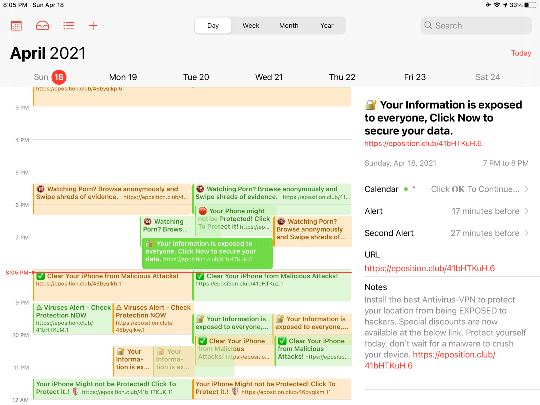 Whilst not a malware infection in the traditional sense, if this exploit is observed on your device, it is highly probable that you were manipulated (via a simple click on a website link) into “subscribing” an additional (unwanted) Calendar to your device - and this unexpected Calendar is exposing unwanted calendar events and sending you unexpected “adverts” or other warnings.