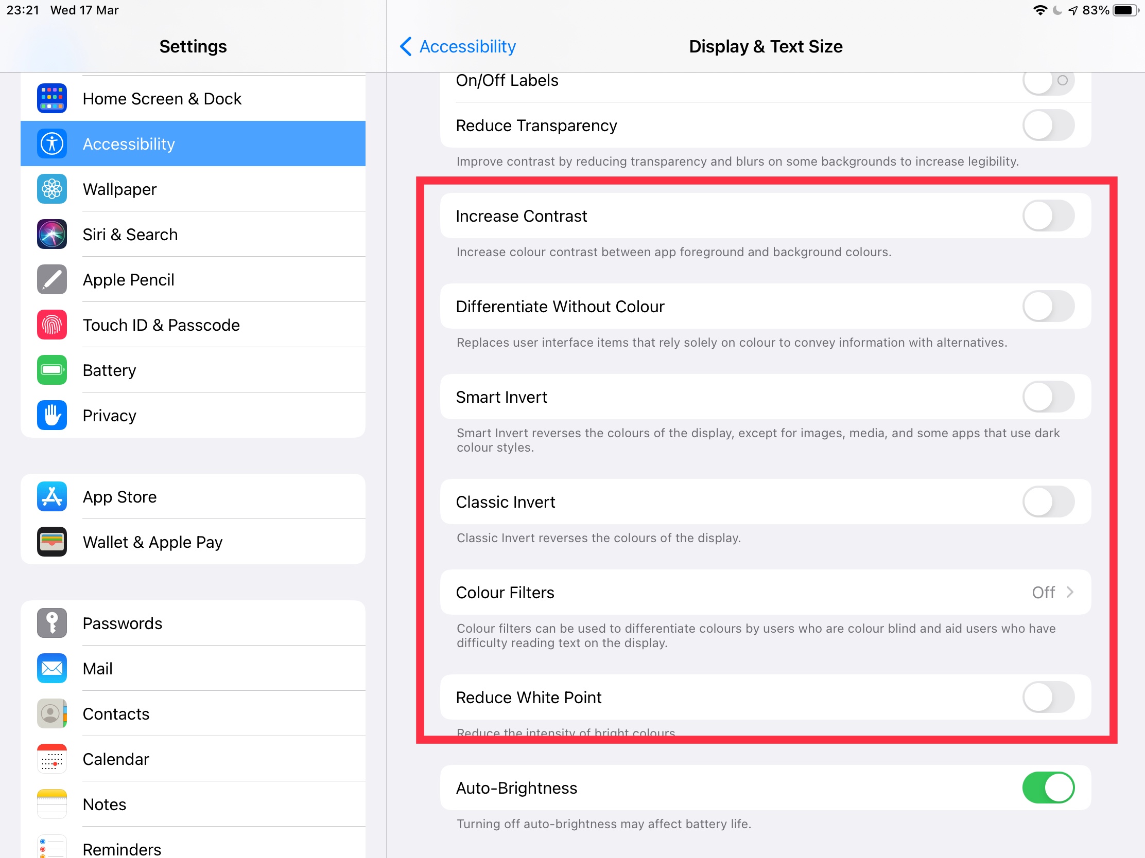 If the screen colours appear to be distorted or unnatural, you need to check some key Accessibility settings that are intended to compensate for specific colour-vision issues: