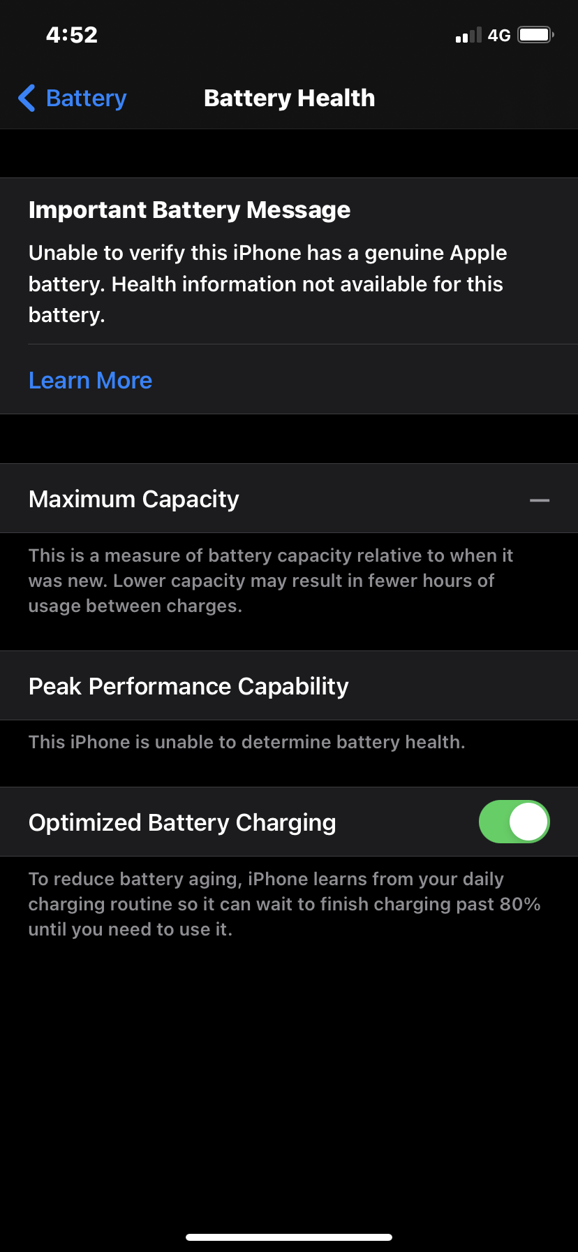 If you see this message, the battery in your iPhone cannot be verified, and reported battery health information isn't available. This might be due to the installation of a battery that is not a new, genuine battery. This message applies to iPhone XS, iPhone XS Max, iPhone XR, and later.