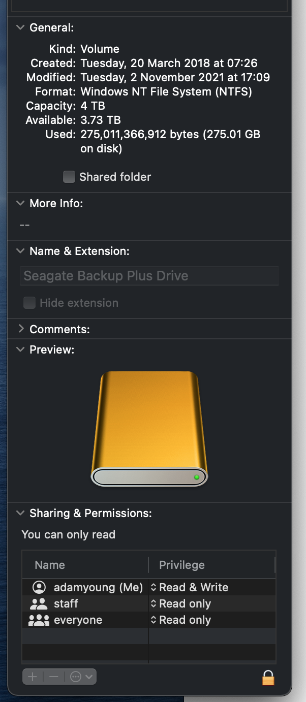 That drive is re-mounted as before but it's Read-only and I can't make it writeable despite the permissions seeming to show that it is.