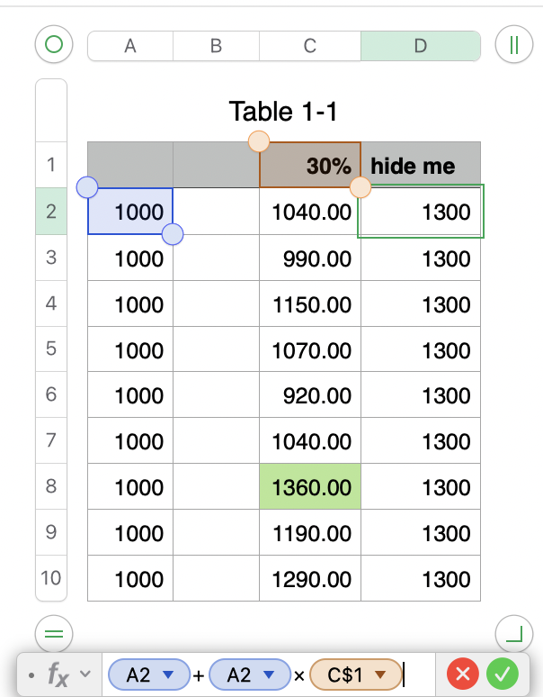 Column A contains the base values. For simplicity, I've set them all to 1000.