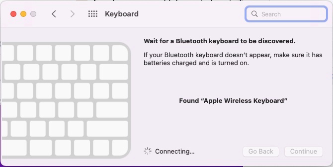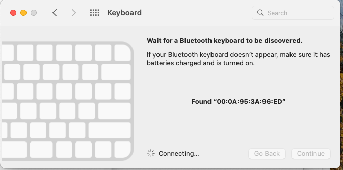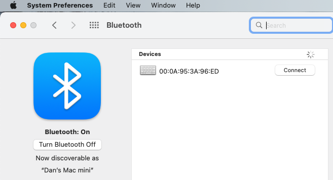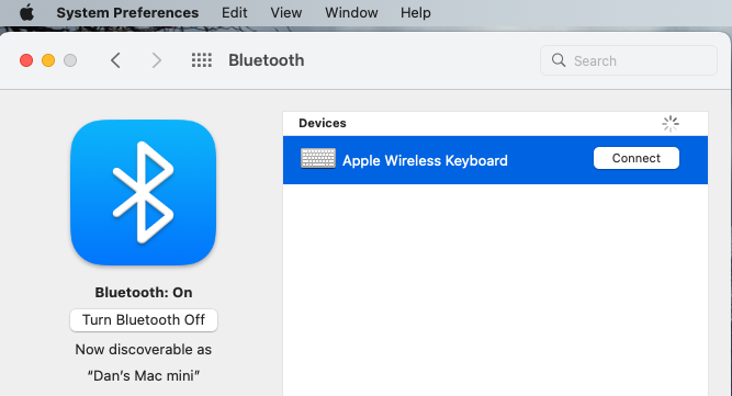 Just upgraded 2020 Mac mini to OS 12.3. Now trying to connect older Apple Wireless Keyboard via BT. Little green power light on bottom of keyboard blinks, Bluetooth prefs sees the keyboard, I click the connect button, it grays out, the gearwheel spins, but nothing else happens. 30 seconds later the connect button goes active again. I've turned the keyboard power off/on, turned BT off/on, restarted the computer. What's going on?