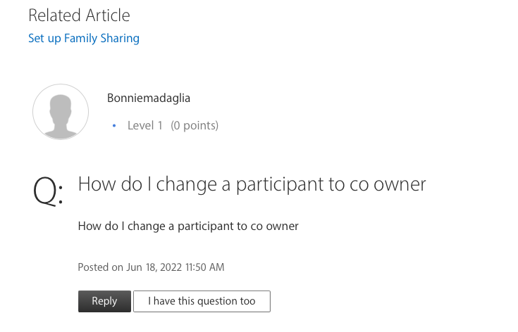 Actually, I never mentioned family sharing. My daughter has her own card, but because I didn’t add her as coowner right away I’m having a hard time adding her as coowner on the card ( Apple Card) now. I’d like her to be able to pay her own bill.
