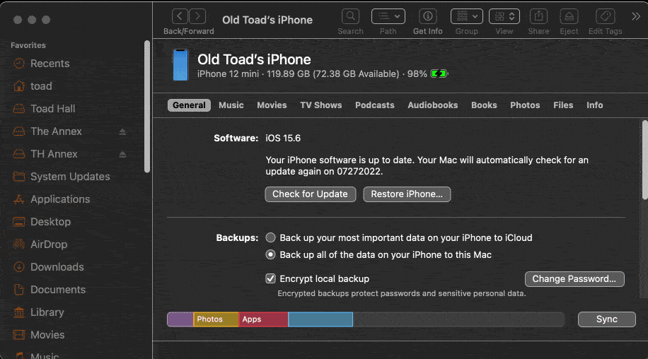 iPhones and iPads can be managed by the Finder when connected via cable: