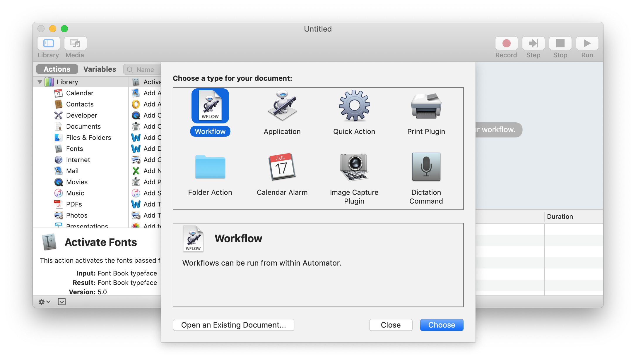 While I'm in Automator, whenever I click "File > New" there is no choice to create a new "Service" — and the closest I can find to match the directions is the choice of "Workflow" which is at least mentioned in the directions. Below is what I see on "File > New"