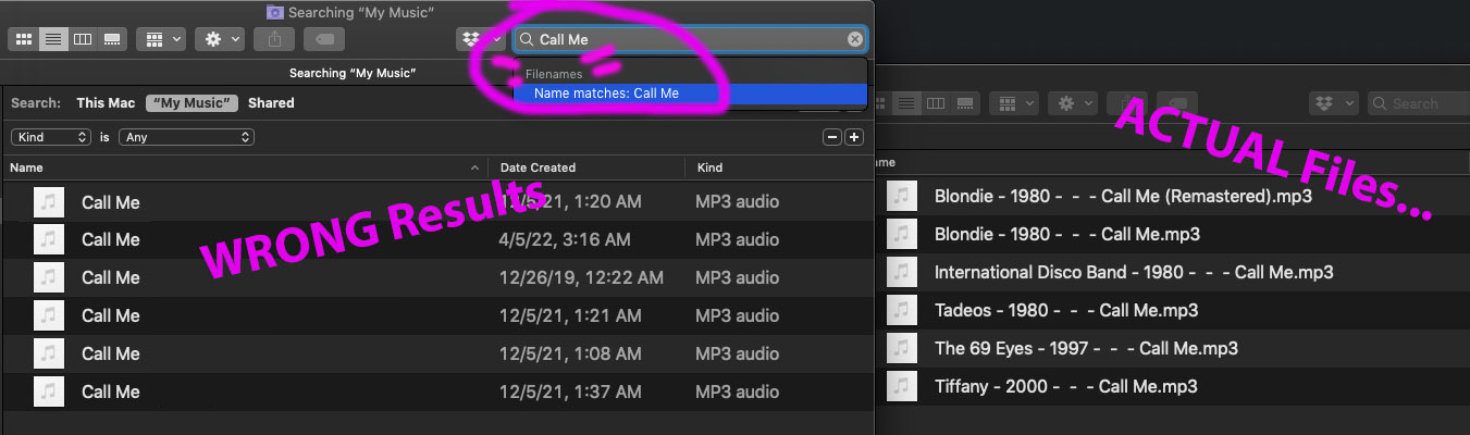 In my screenshot example I search for "Call me". I have 6x different songs called that, by 6x DIFFERENT artists. The search results do NOT let me see which is which. There is NO way to have it show the actual filenames (which my files are named Artist + Album + Song Name = SUPER easy to tell which is which). The ONLY way to tell which is which is by Right Clicking > Get Info for ALL SIX files (or doing something more drastic like copying them all to another folder then manually browsing to that folder to see the filenames).
