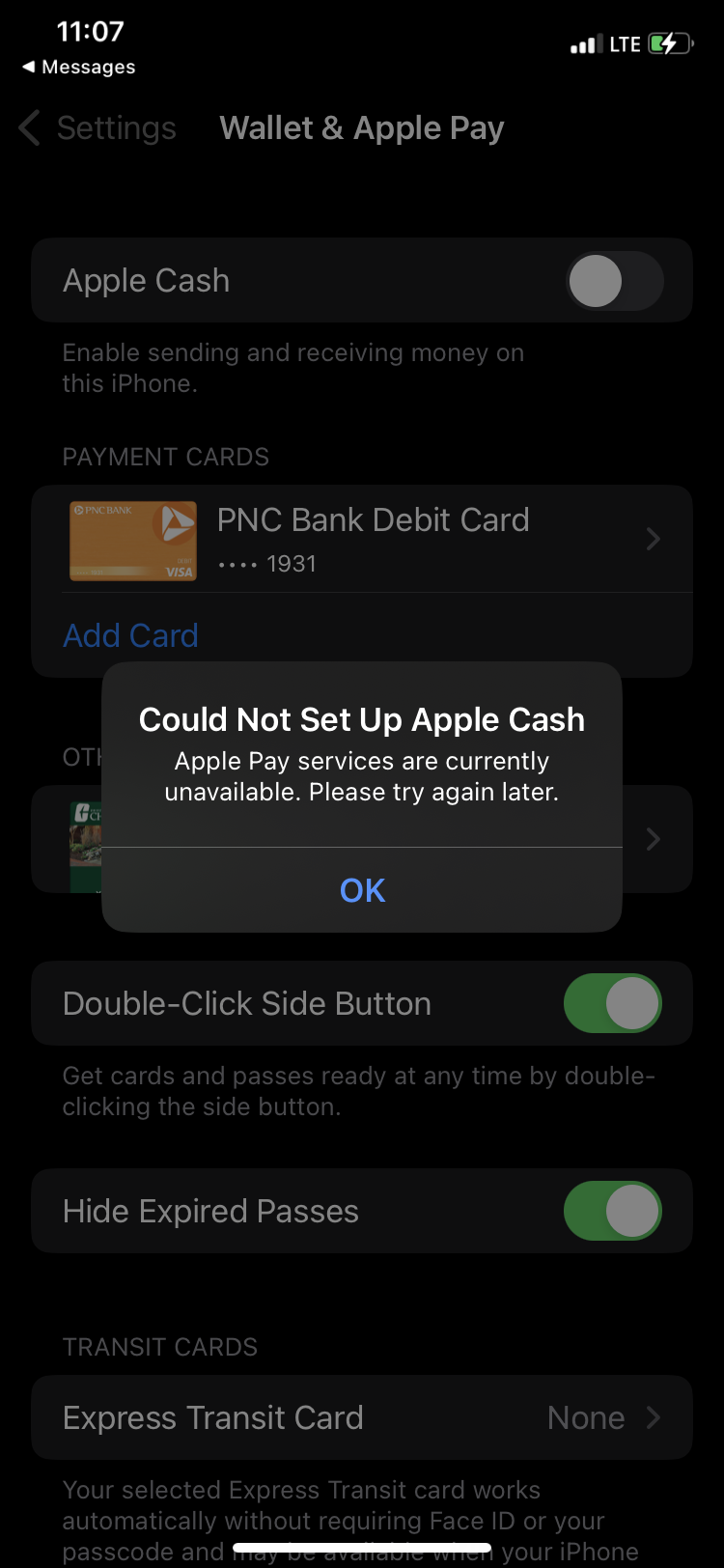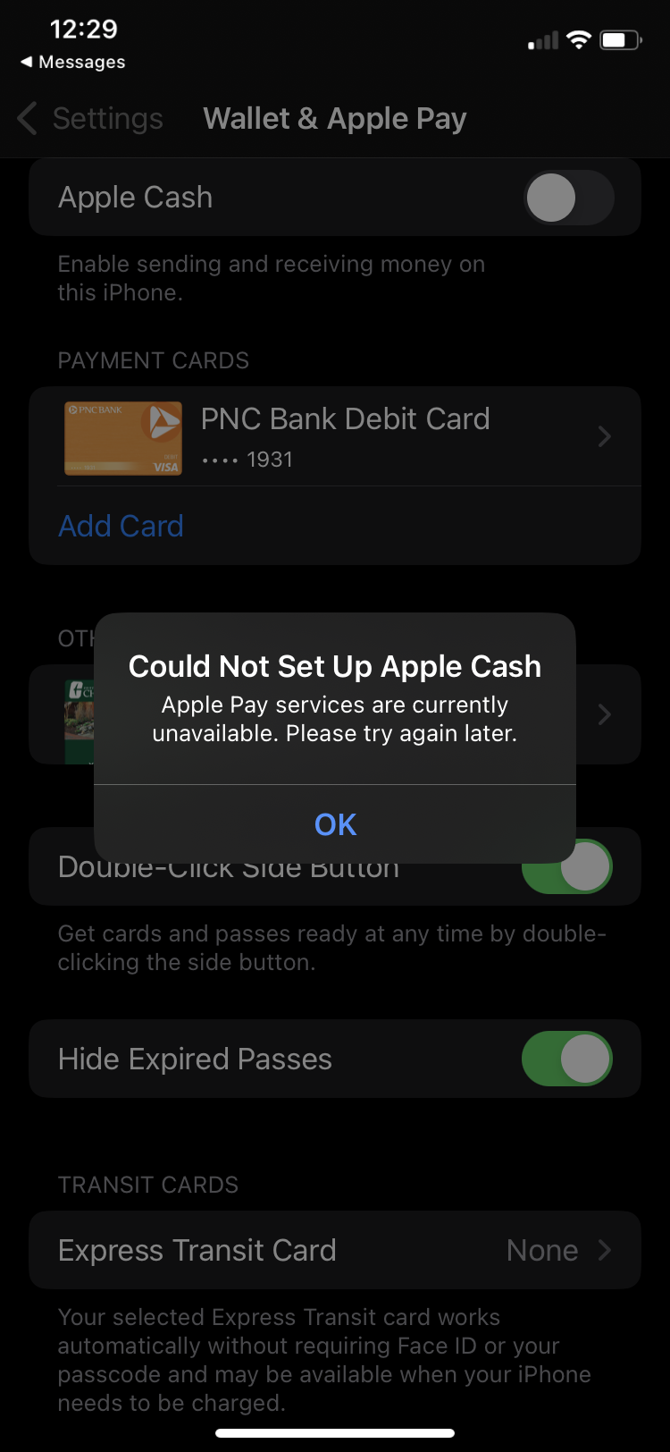 Every time I go to enable Apple Cash in the settings, it flips on, then flips off and displays an error message. I thought I set everything up correctly with my card and bank but I could be mistaken.