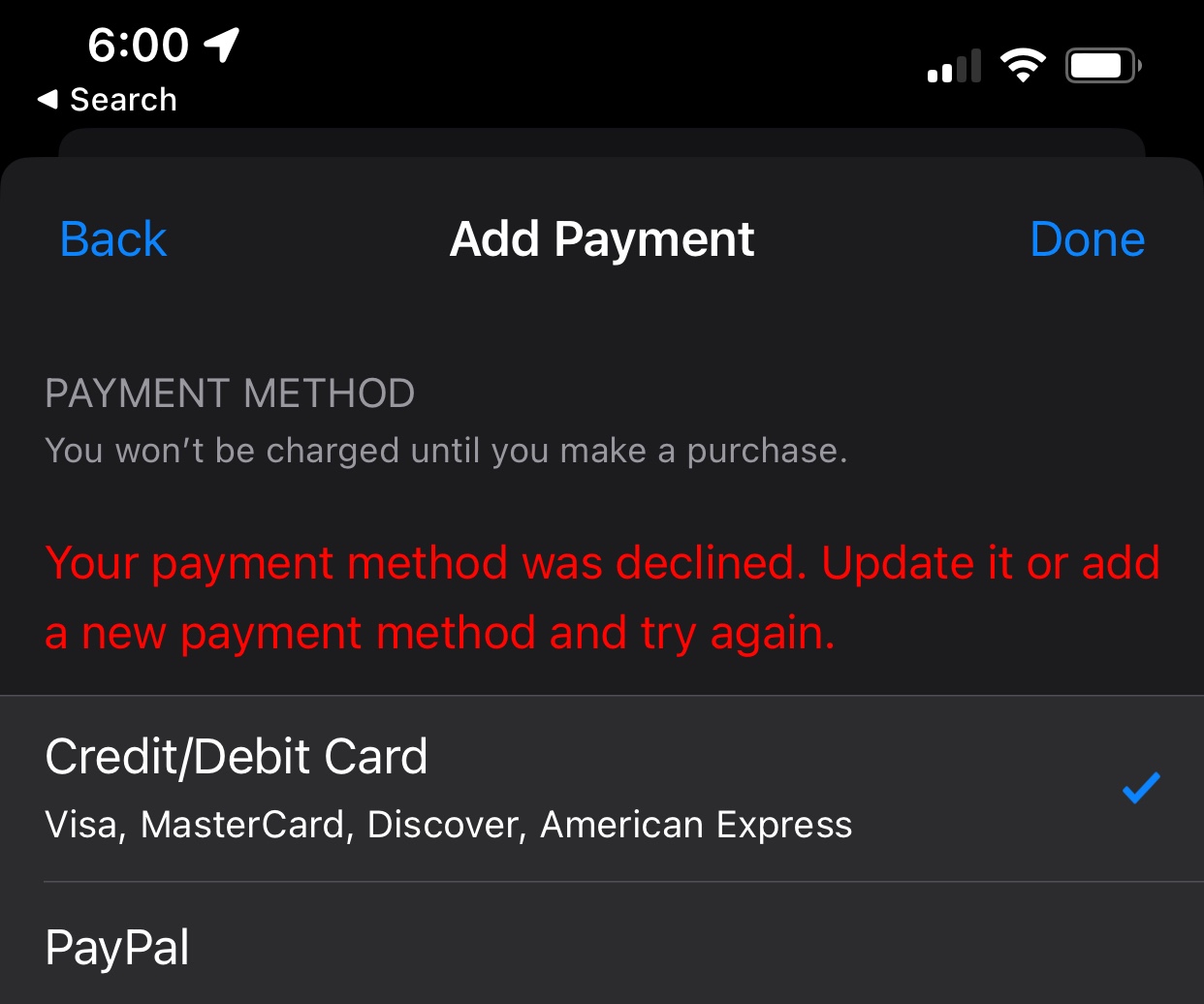 Review this document about what to do "If your payment method is declined in the App Store or iTunes Store" Click here --> If your payment method is declined in the App Store or iTunes Store - Apple Support It mostly just suggests you make sure your payment method is up to date or to try a different one. Apple is probably just checking with the system linking to your financial institution and asking if the payment method is valid. The system is providing a negative response. Make sure the name and address are entered exactly as it appears on your financial institution bills and that the 3 digit CVV is correct. Check with your financial institution about the status of your card.