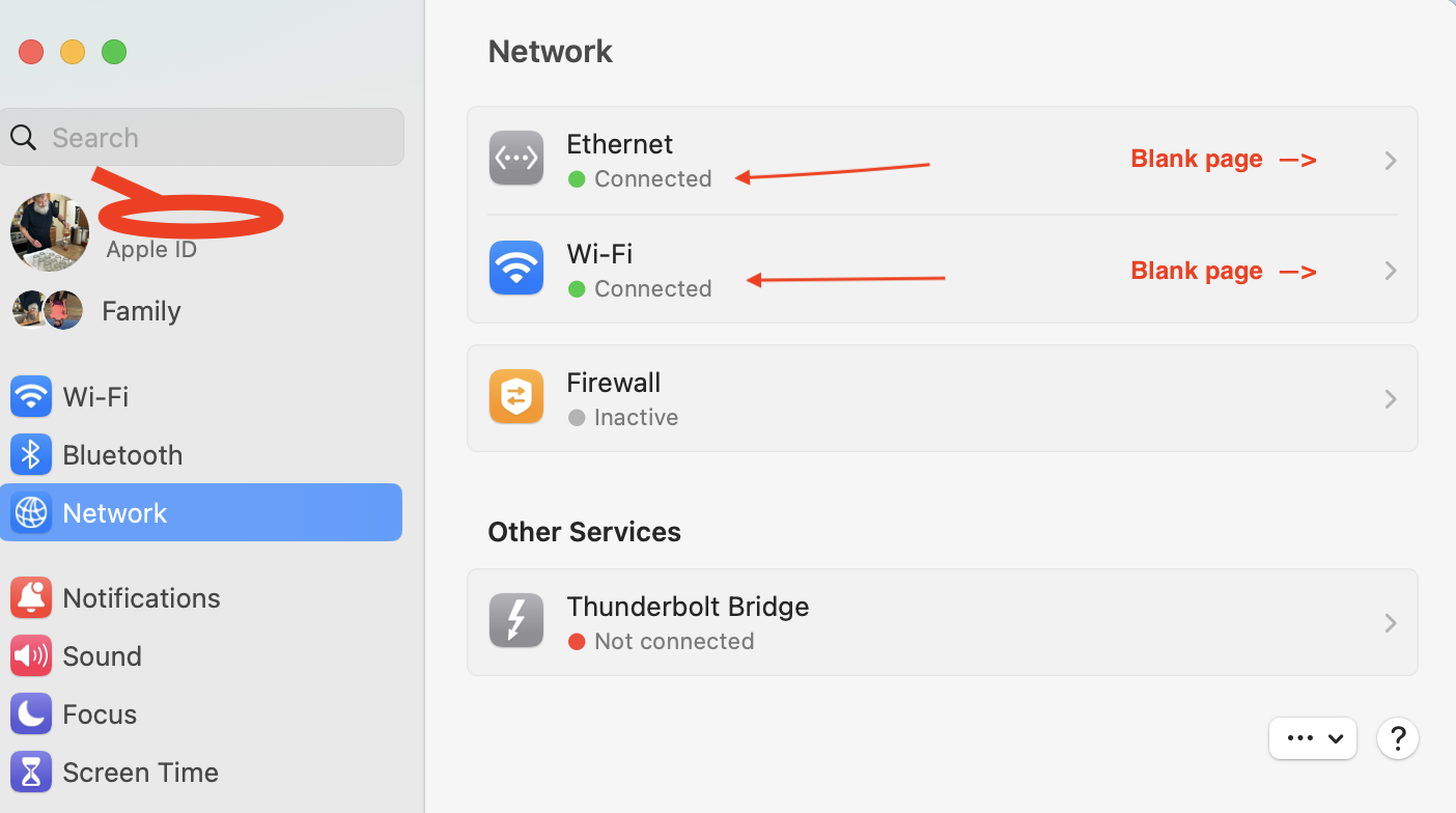 ventura system settings network settings submenu missing (the actual network settings pane is blank)