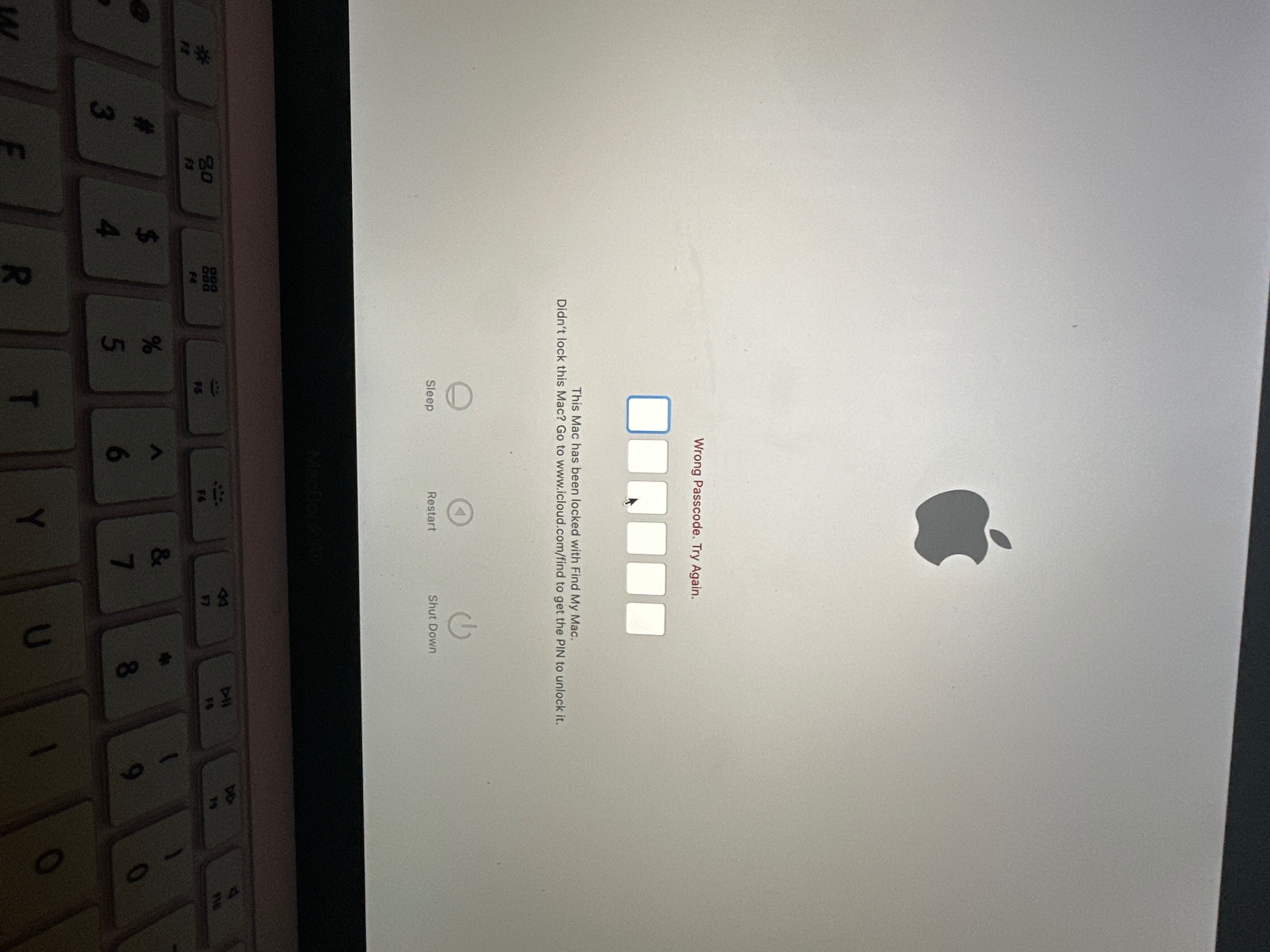 Your Mac asks for a PIN code when it has been remotely locked using Find My. Enter the four-digit or six-digit passcode to continue.