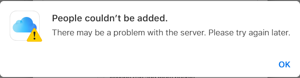 • In iCloud web, attempting to re-share the folder times out with "People couldn't be added. There may be a problem with the server. Please try again later"