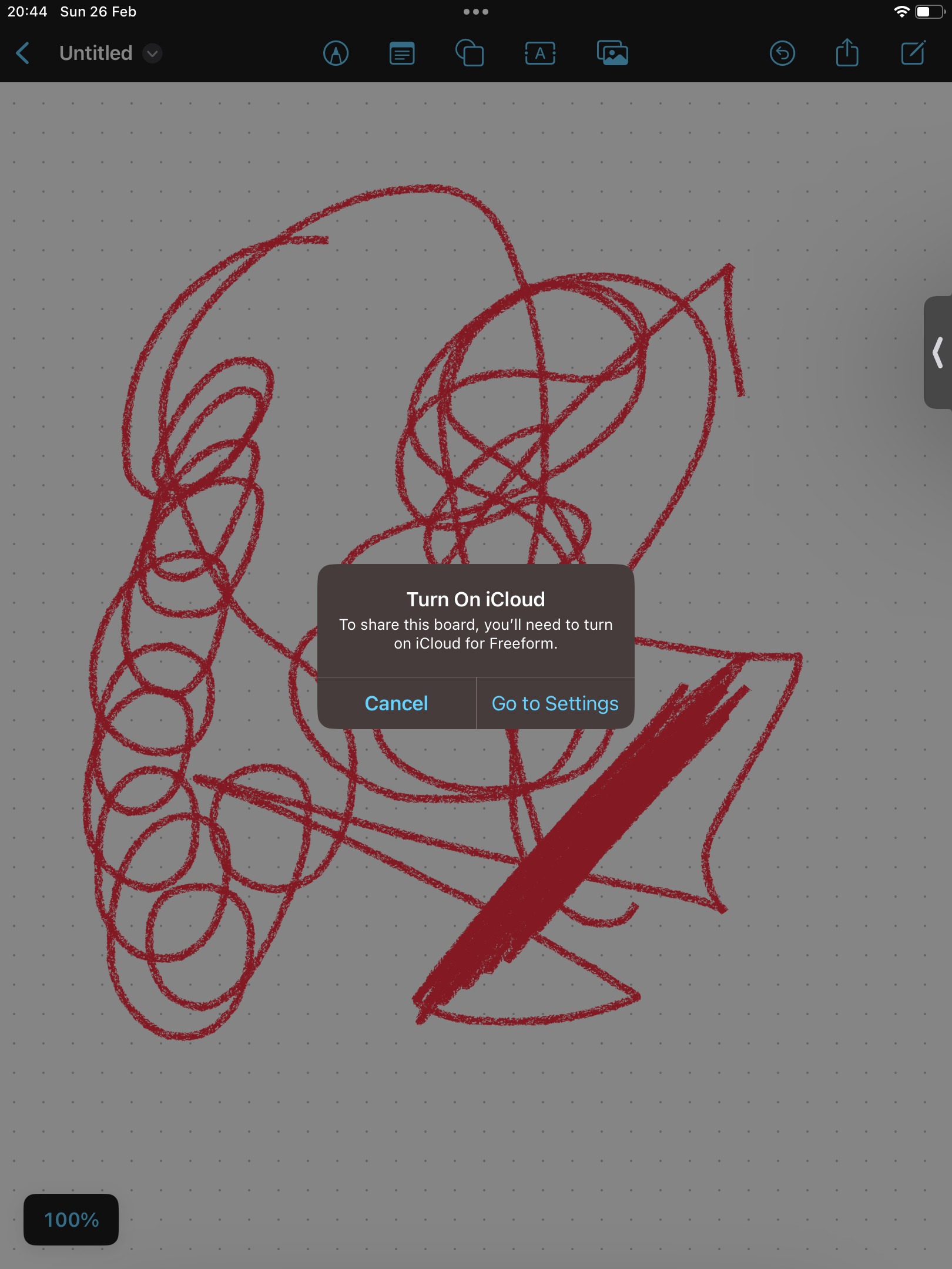 I’m using Freeform on my iPad and whenever I tap on the share/save button while using the app it tells me to turn on iCloud in my settings (see first pic). Under iCloud settings Freeform is enabled (see second pic). I tried rebooting the machine and tried several time to switch off and back on iCloud for Freeform (despite the warning that I might loose my files and then asking if want to merge them) but I’m still getting the same error.