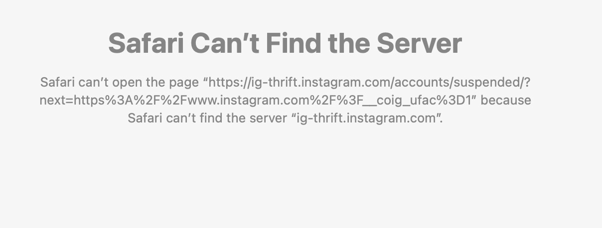 It keeps redirecting to this address: https://ig-thrift.instagram.com/accounts/suspended/?next=https%3A%2F%2Fwww.instagram.com%2F%3F__coig_ufac%3D1