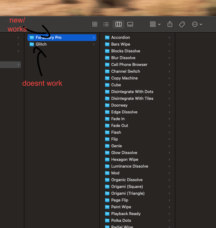 I tried transferring the files to the movies/motion templets/ transitions folder. I also tried the .localized trick.