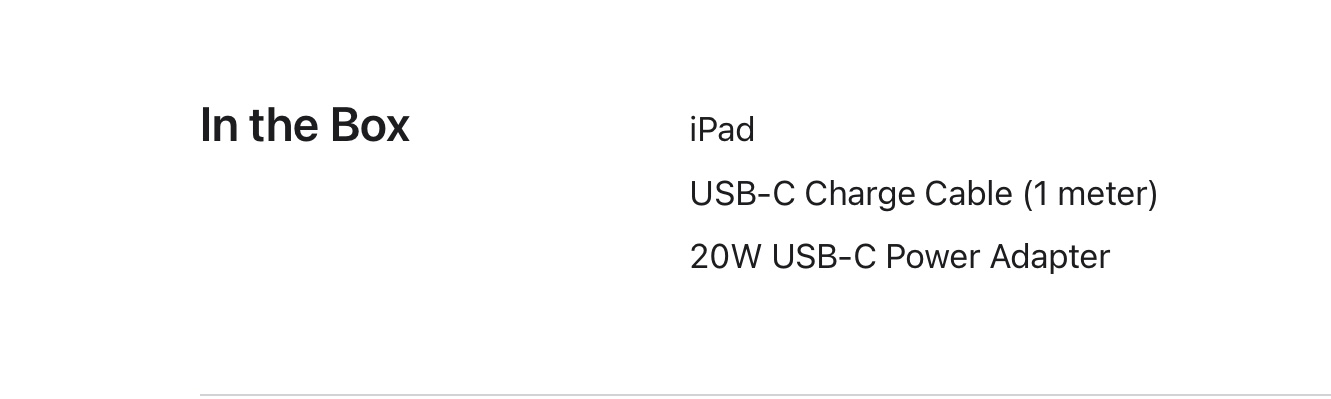 Current models of iPad are supplied in the box with a 20W USB-C Power Adapter and charging cable.