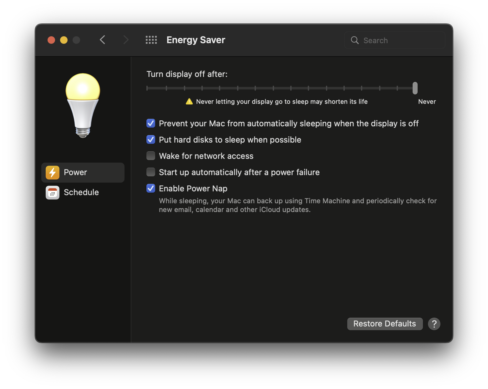 Check "Prevent your Mac from automatic sleeping when display is off" and only allow the display to turn off.