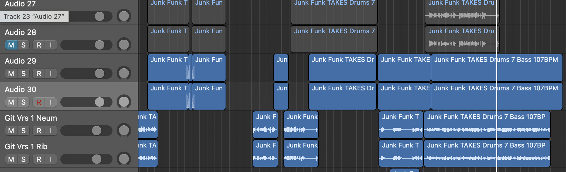 To mix both, I imported the guitar takes of Project 1 into Project 2 using Logic's Browsers button.