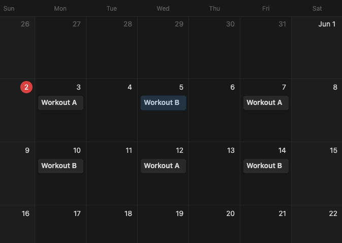 Using your example, you’ll need to create 6 “independent” events, recurring every 2 weeks. Doing so, “Workout A” on the 3rd would recur on the 17th, “Workout B” on the 10th would recur on the 24th and so on.