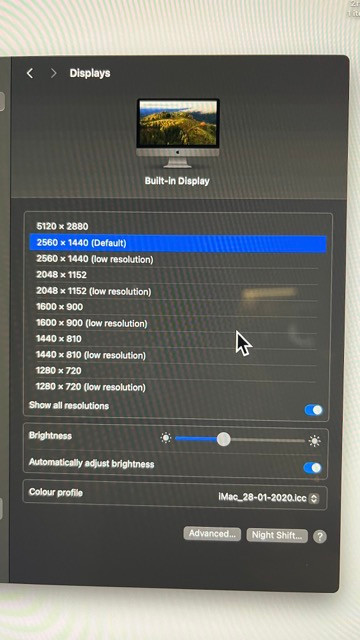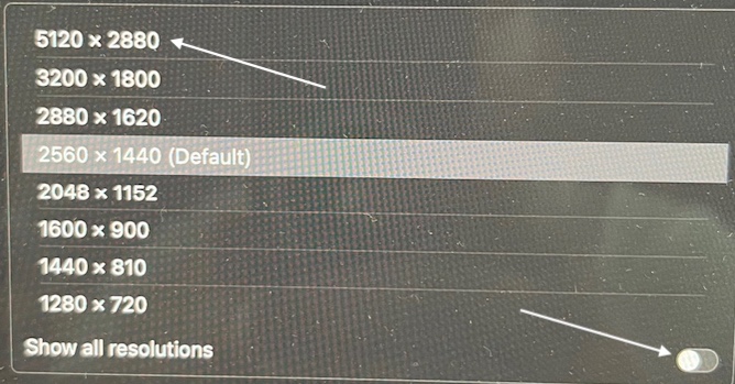 You would want to avoid "2560x1440 (low-res)" mode, where the machine draws on a 2560x1440 canvas and then does an ugly digital zoom to paint the 5120x2880 screen. I suspect that you have to "Show all resolutions" to even see the "(low-res)" modes as choices.