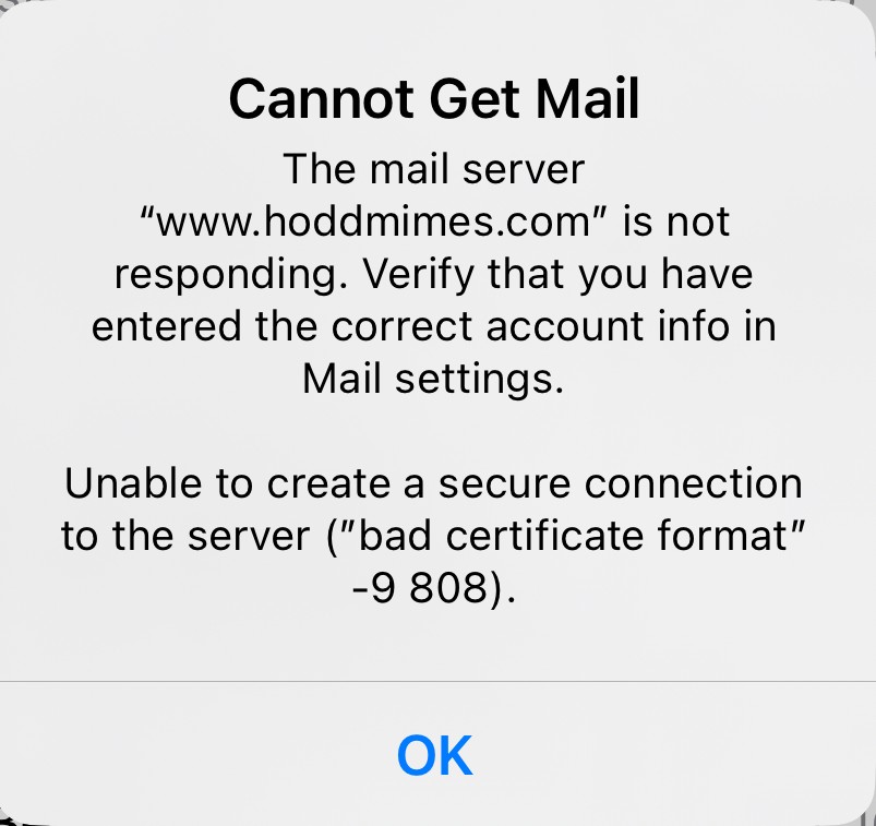 The mail client error is "Posix 50" and/or "invalid certificate format -9 808"