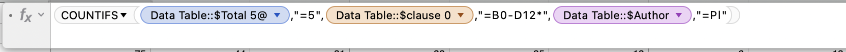 COUNTIFS(Data Table::$Total 5@,"=5",Data Table::$clause 0,"=B0-D12*",Data Table::$Author,"=T")