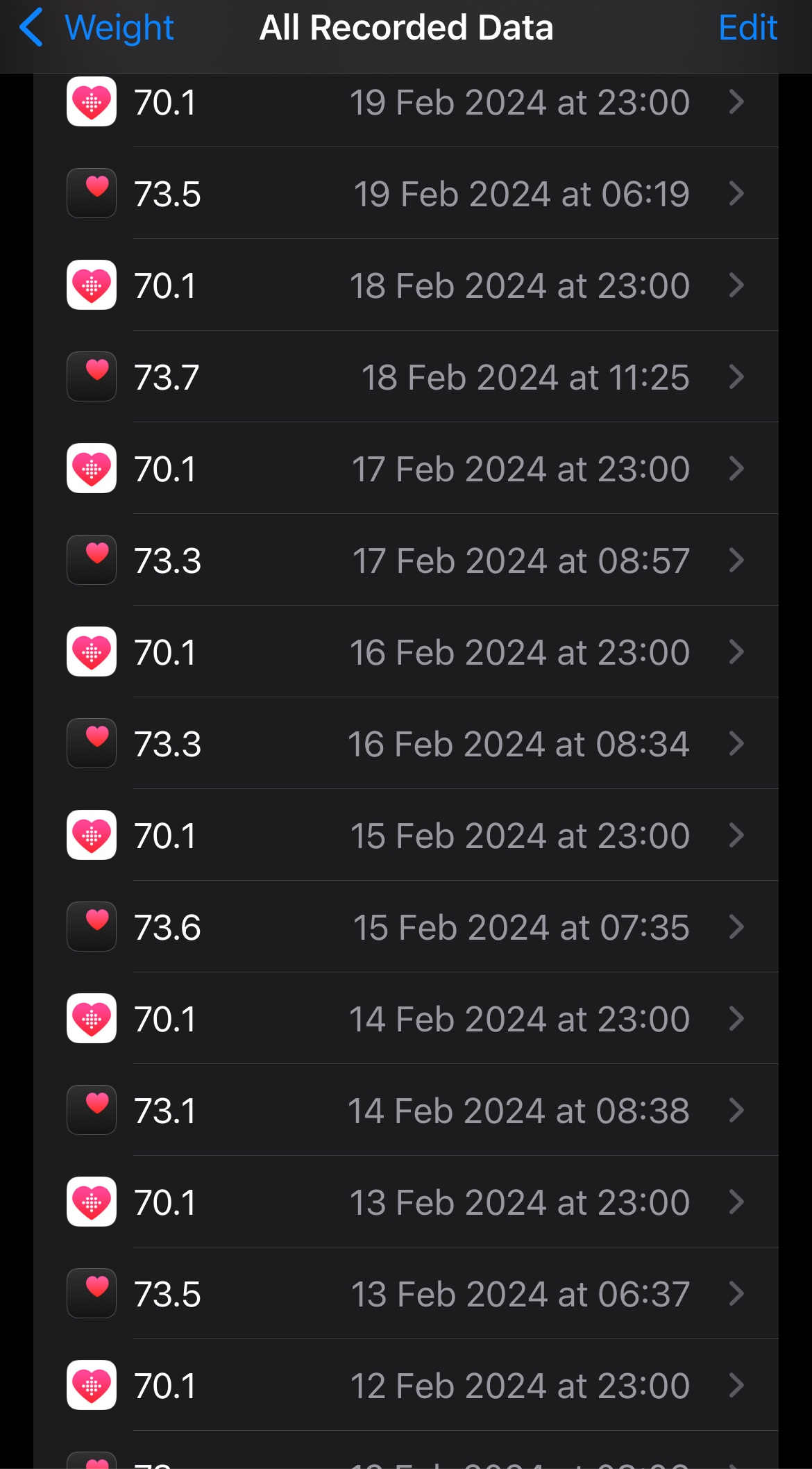 I used an app called Power Sync to sync over my health data from fitbit as I’ve recently got an apple watch. I was tracking my weight with apple health already however, so syncing has resulting in an erroneous weight entry being added for every day for the last couple of years or so. See the picture below:
