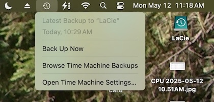 An external Lacie backup drive is connected with an Apple Thunderbolt 4 cable to one of the three Thunderbolt 5 ports in back. Time Machine backs up the Mac Mini M4 Pro once a week.