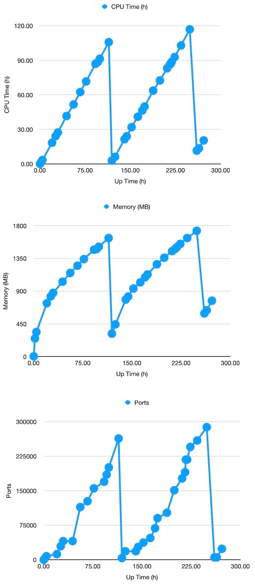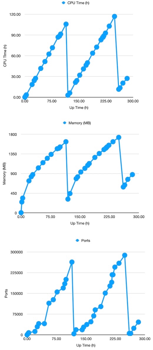 Thank you, den.thed, for the excellent descriptions. Given the growing amount of memory allocated and of the growing number of ports opened, it appears that processes or services or apps are CHECKING IN, but they are NOT CHECKING OUT.