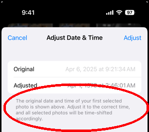 How can I restore original time and date on all iPhone photos?