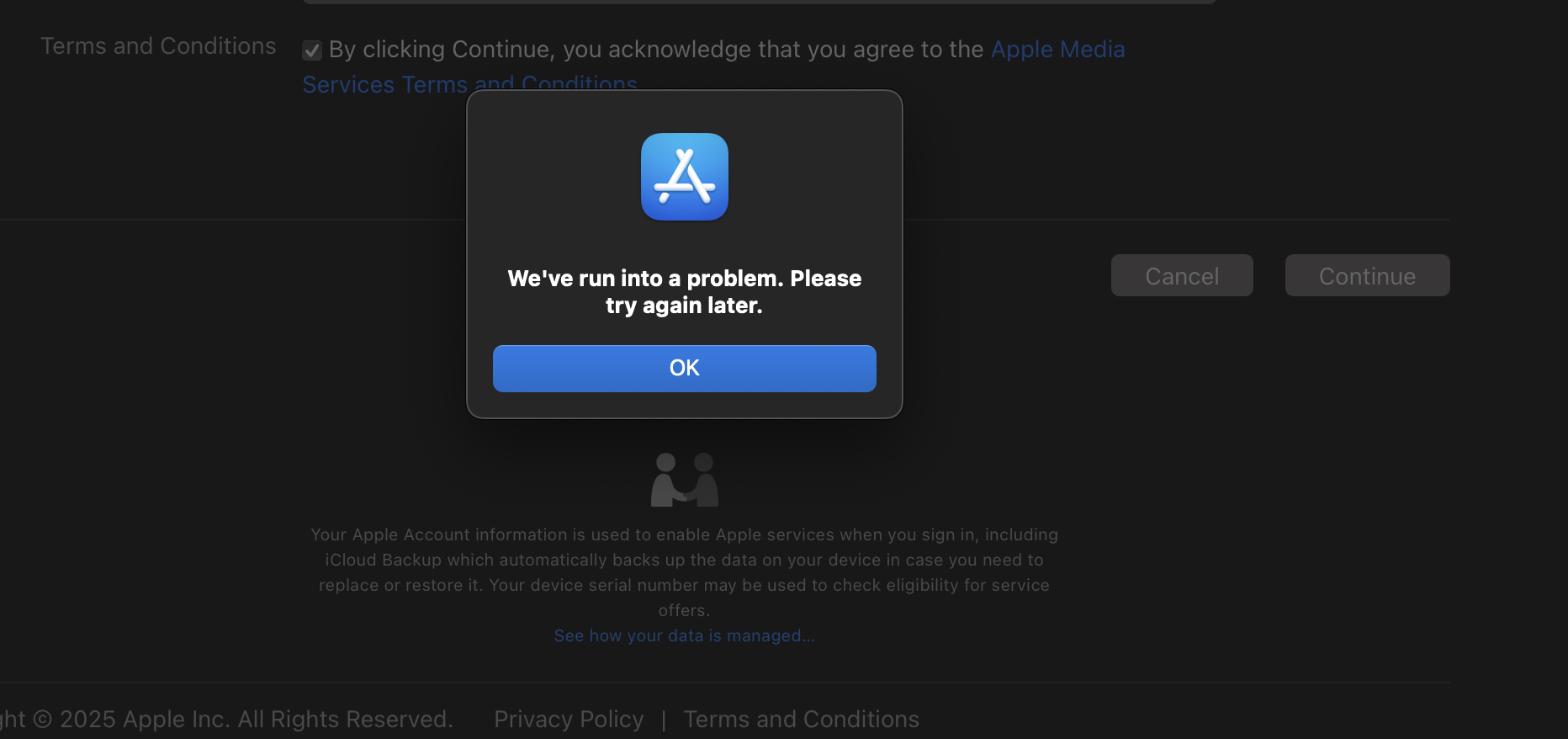 After which it says- "This account has not yet been used with the App Store. Please review your account information." Clicking on the review button takes me to the above page, where my email is present, I check on the Terms & Conditions. Clicking on Continue gives this error, which gives no information about what is wrong.