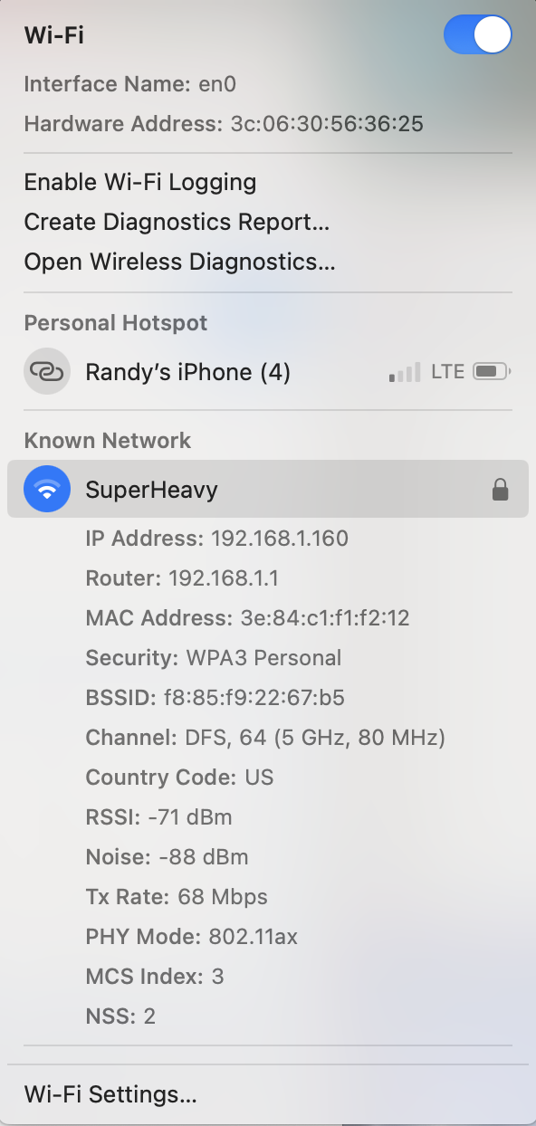 Next is to hold down the Option key and click the Wi-Fi icon as before. The screen that opens shows operating parameters of your Wi-Fi network. Screenshot, transcribe, or photograph the results and post back in a reply on the forums. Looks like this older one.