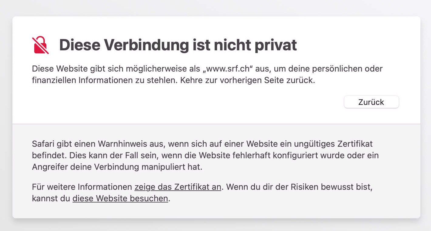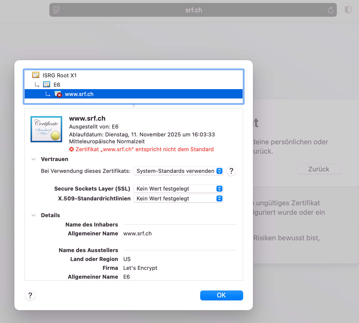 Except Safari: every website we open brings up a certificate error "The connection is not private". We click on "View the certificate" and see the error "certificate is not standards compliant".