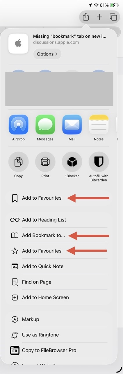 I just bought a new iPad Air 10 (26.0.1) and noticed the “add bookmark” tab under the arrow dropdown tab is missing. Any suggestions are appreciated.
