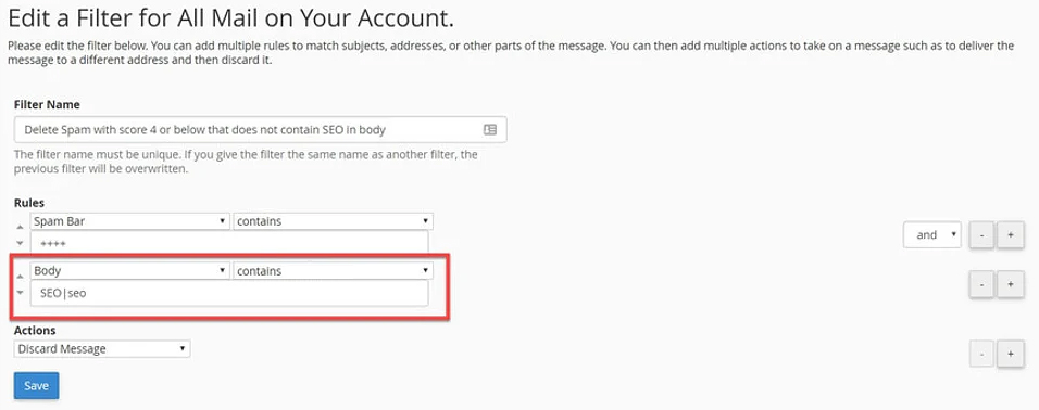 Choose Body so the filter is looking at the body text of all incoming emails. Then use contains so the filter looks for a specific string of text. Look through a half dozen or so of these dumb scam emails and look for a line that's in every one, and definitely wouldn't be in any legitimate email. Like, I've installed a Trojan virus, and put that in the text field (where this example says SEO|seo). And finally, choose to discard any email that matches the filter.