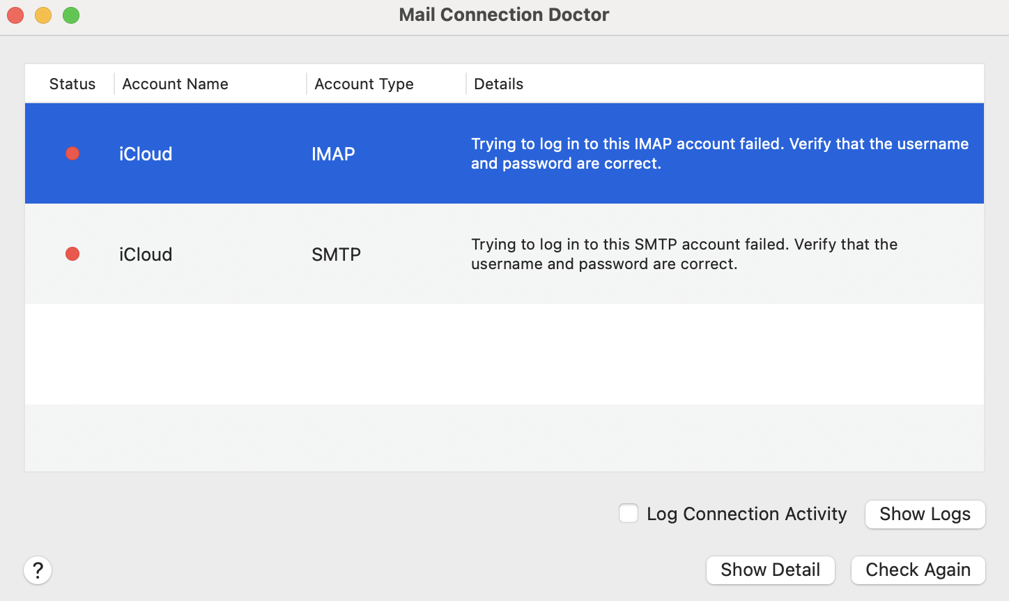 — Mail.app>Window>Connection Doctor you should see all green for both IMAP server and SMTP server...